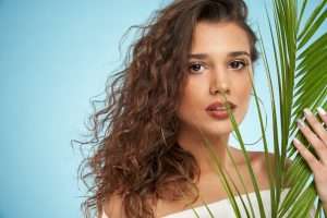Pretty woman touching palm leaf, isolated on blue.
